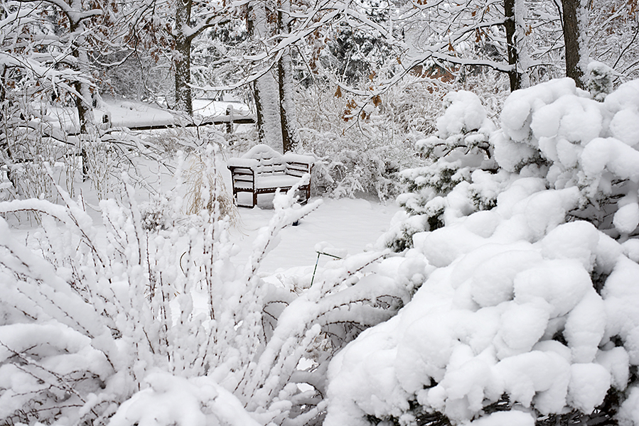 Snowy bench in garden Published March 6, 2013 at 899 × 600 in What the Storm Brought Snowy bench in garden