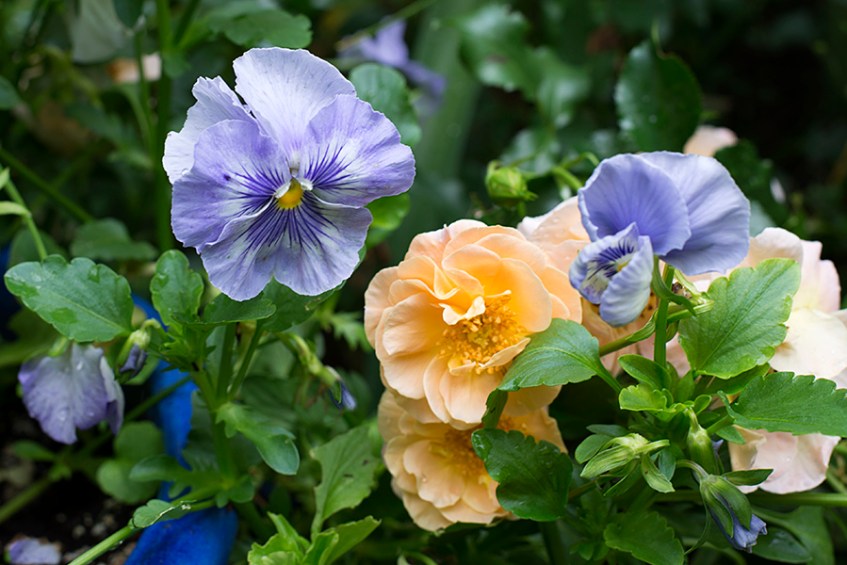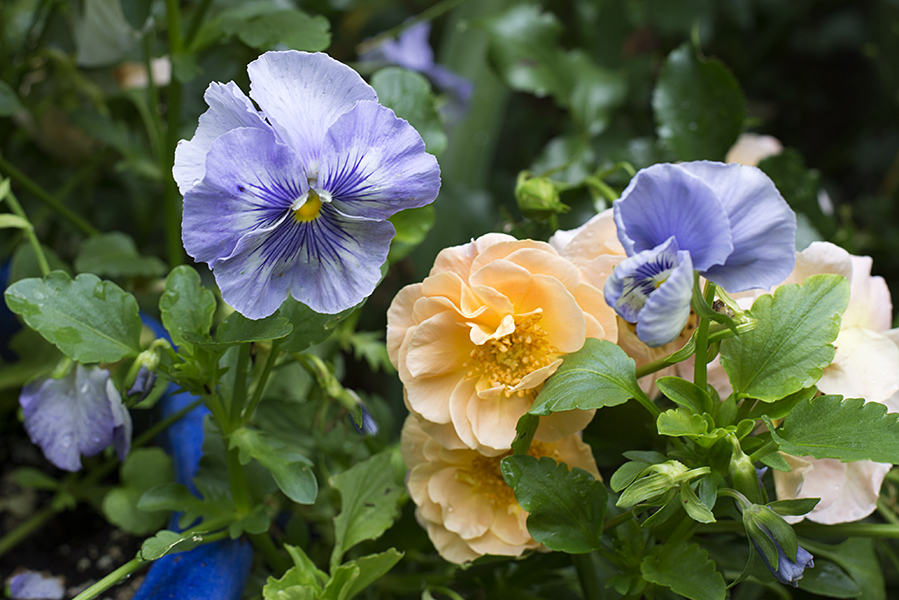 Rose and pansy in the peach and blue bed Published June 13, 2015 at 899 × 600 in The Wood Thrush Sings Rose and pansy in the peach and blue bed