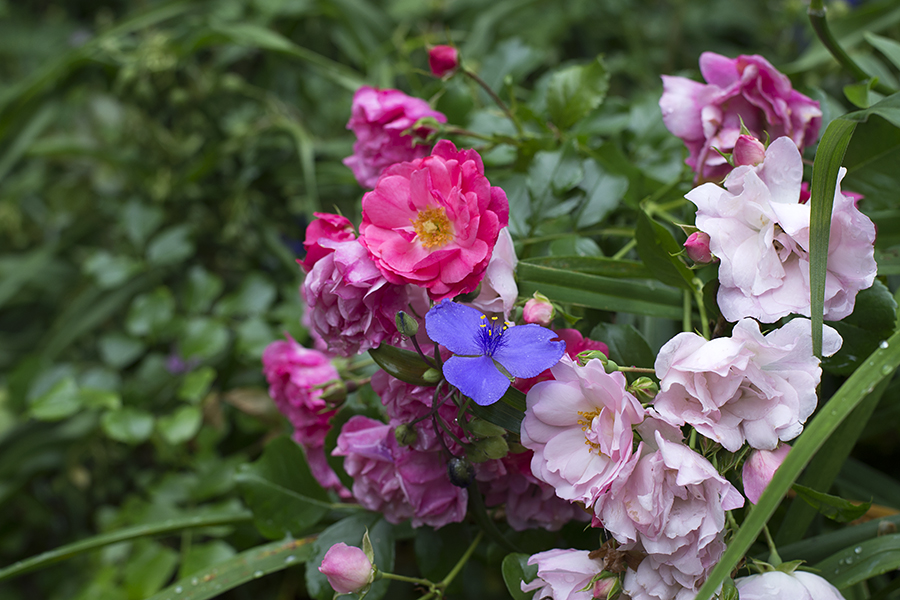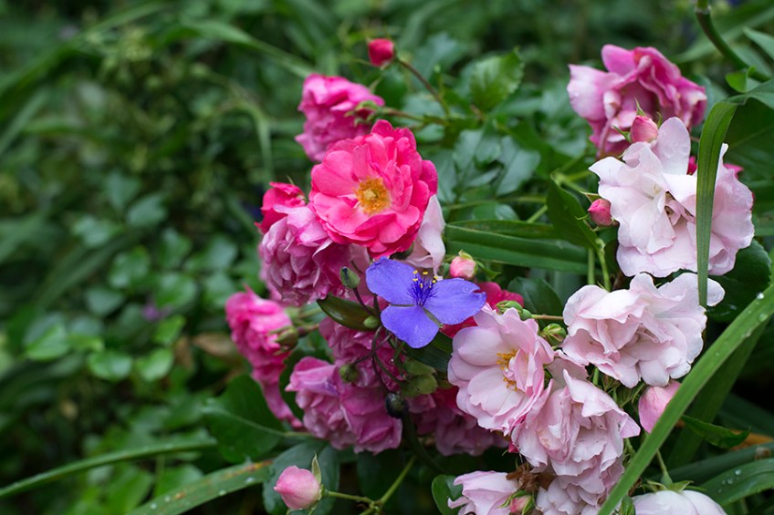 rosetradescantWP Published July 8, 2016 at 900 × 600 in A Garden in the Woods ‘Carpet Pink’ rose and Tradescantia ohioensis