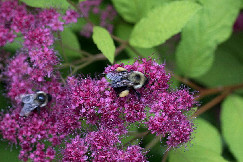 beespirea Published June 4, 2017 at 900 × 600 in An instrument of grace Bumblebees with pollen sacs on Spirea ‘Goldflame’