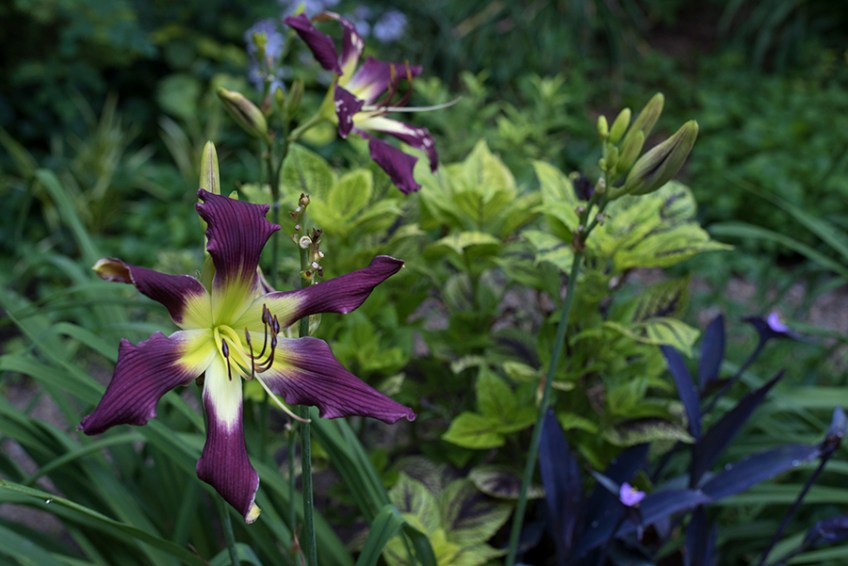 Oh, these color combinations are brilliant. That deep blue of the leaves in the background…the lime green…perfect foils for the day lily, one that’s well named. 🙂