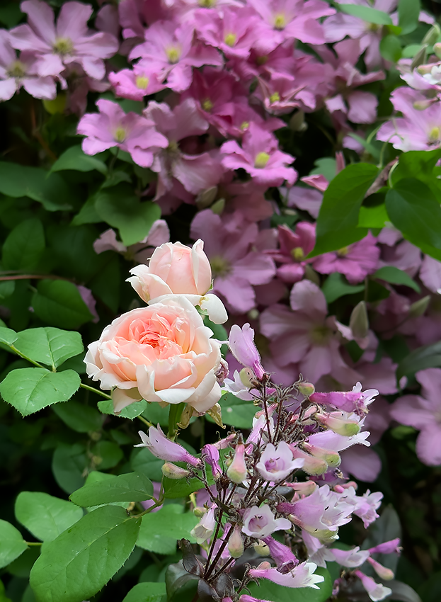 roseclematispenstemonWP Published July 4, 2023 at 623 × 850 in Life in a garden Rose ‘Eglantyne’ and clematis