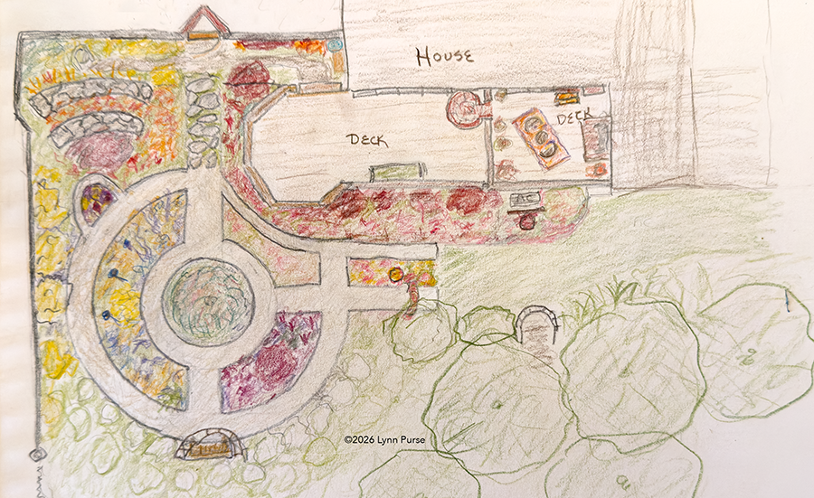 I turned to one of my favorite books for inspiration and guidance – The Inward Garden by Julie Moir Messervy.  In a unique garden book that explores archetypes common to mythology and fairytales as a source for garden design, she discussed the psychological power of caves, promontories, and liminal spaces such as paths and gates, all which intrigued me and seemed to be present or possible on the property. But her description of a sacred tree archetype was the key takeaway. I imagined a series of concentric circles anchored by a small tree that would become the epicenter of the garden, a circle within a circle. A big job for a little tree. Here’s the plan I eventually created.