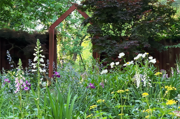 As June arrives, foxgloves and native iris join the peonies in the front garden to create a peak moment of bloom and offer more food for pollinators.