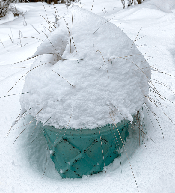 The turquoise pot containing a blue fescue looks like an odd cactus, a rare spot of color in the winter landscape.